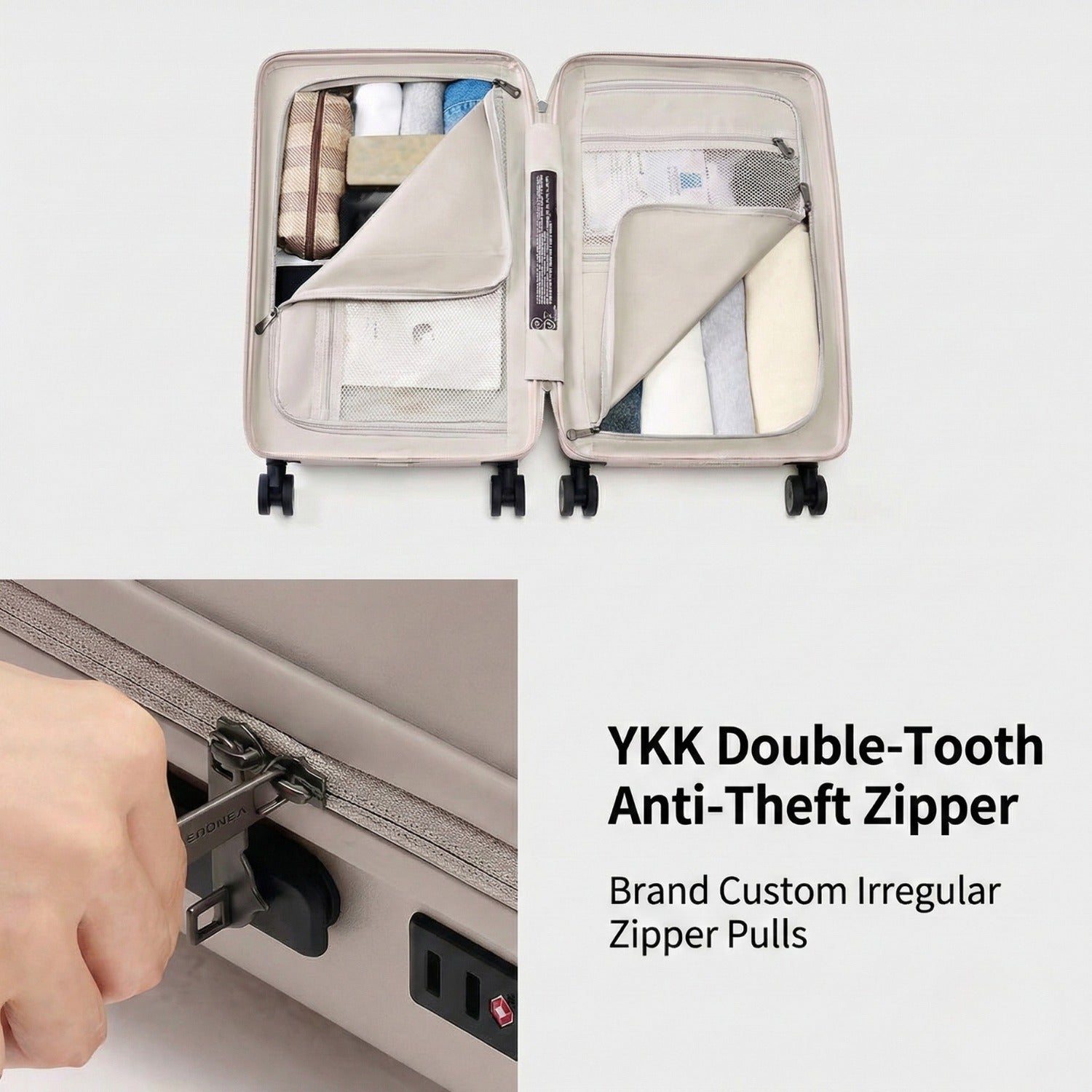 Pack with precision and travel with total peace of mind. Our meticulously designed interior features dual compartments and mesh dividers to keep your essentials neatly arranged, while the heavy-duty YKK double-tooth anti-theft zipper—complete with brand-custom pulls—ensures your belongings stay completely protected on every journey.