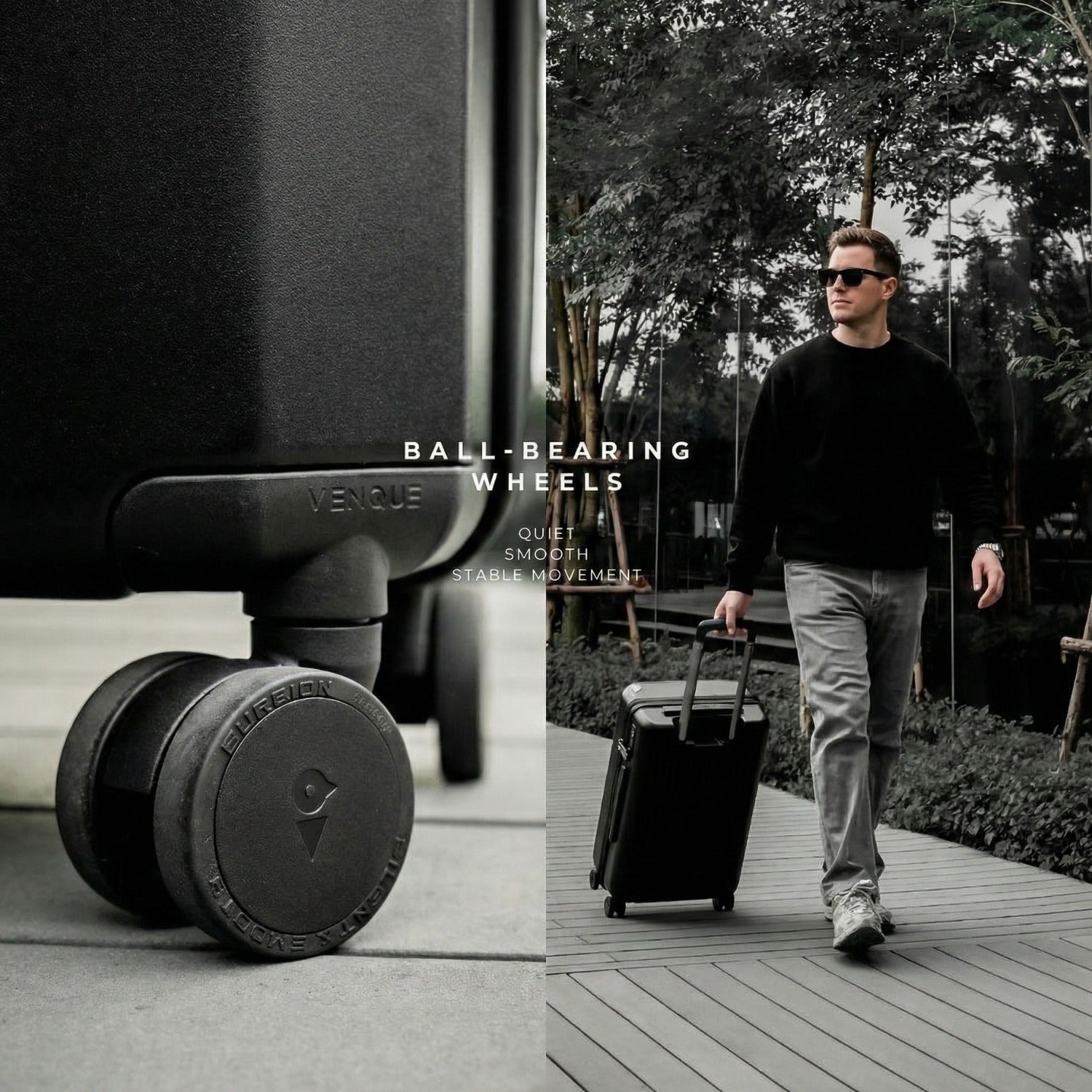 The wheels are noticeably quiet and glide without effort even on tile. Moving between gates feels easier and less tiring. I appreciate the smoother ride during long layovers.