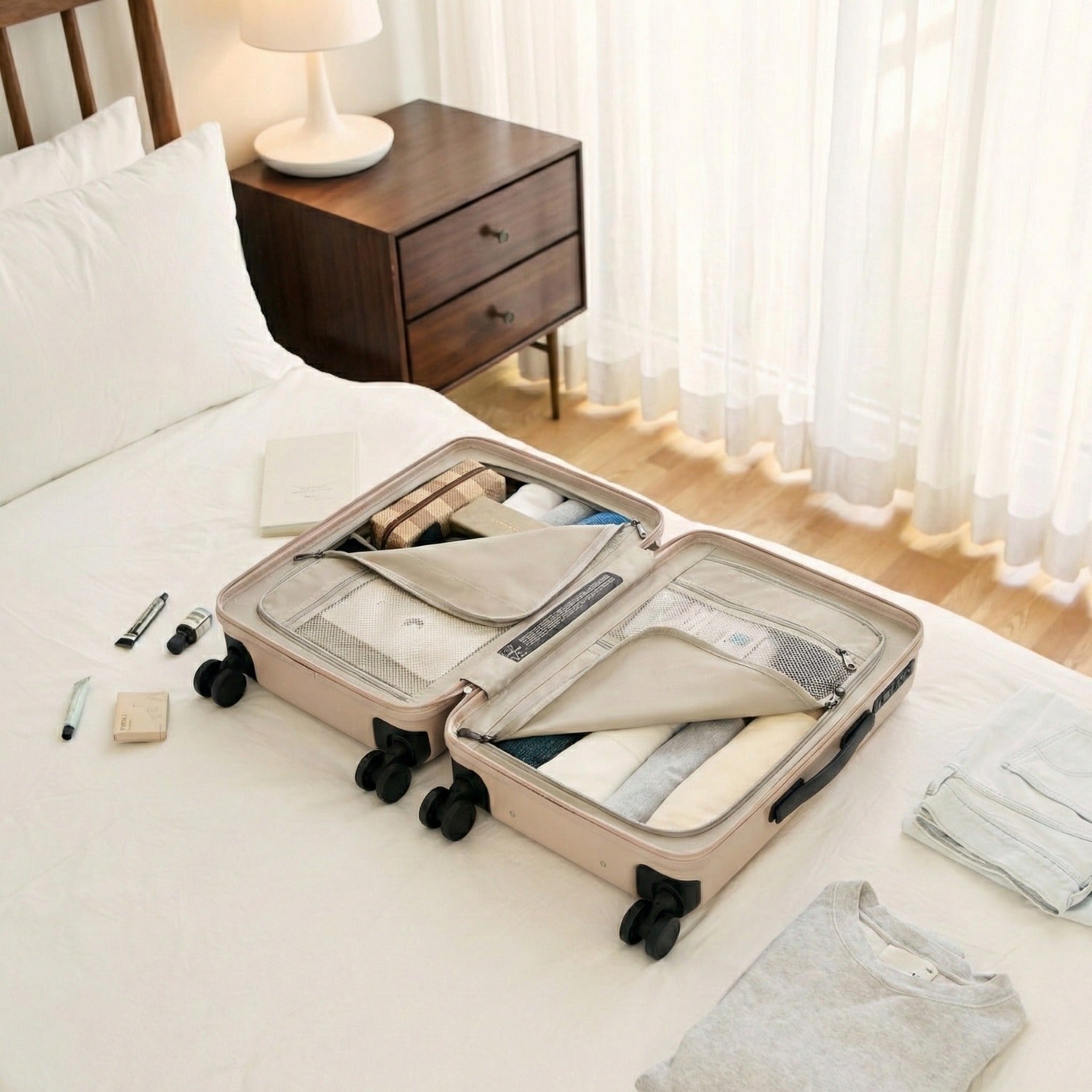 Say goodbye to travel chaos. Our intelligently designed dual-compartment interior features fully zippable covers and breathable mesh pockets, ensuring your wardrobe stays perfectly neat, secure, and easily accessible from takeoff to touchdown. Pack beautifully and focus on the journey ahead.